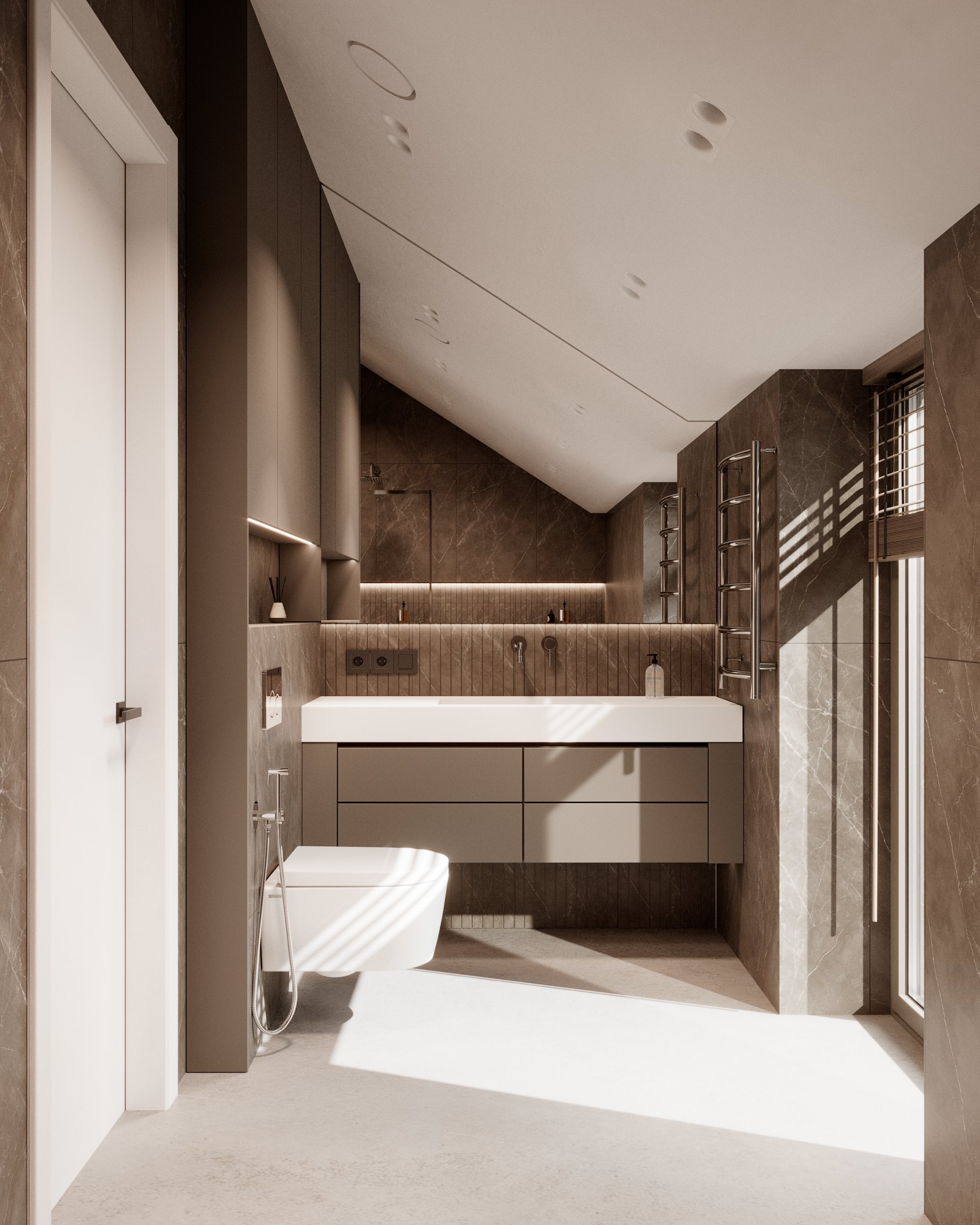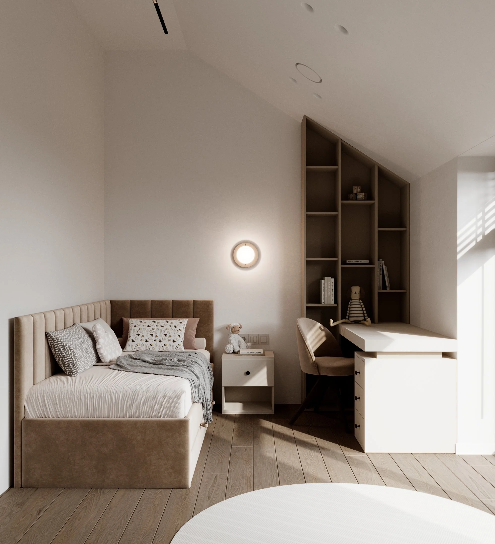 Kiekviena erdvė buvo apgalvota atsižvelgiant į šeimos poreikius: erdvi svetainė sujungta su virtuve ir valgomojo zona, kad būtų patogu bendrauti, tuo tarpu miegamieji ir vaikų kambariai suprojektuoti kaip ramios poilsio zonos. Pabrėžėme šviesos ir erdvės pojūtį, įtraukdami funkcionalius sprendimus, kurie padeda palaikyti tvarką ir komfortą kasdienybėje.